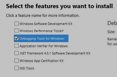 После запуска скачанного средства установки оно предложит вам выбор параметров для установки. Выберите только “Debugging Tools for Windows” и уберите галочки со всех других опций:
