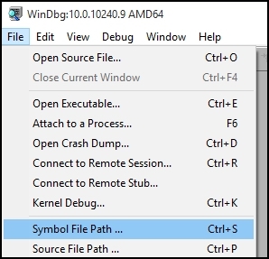 Нажмите «Да», если вы увидите предупреждение «Контроля учетных записей». Появится программное окно отладчика Windows. В меню «File» выберите «Symbol File Path…»: