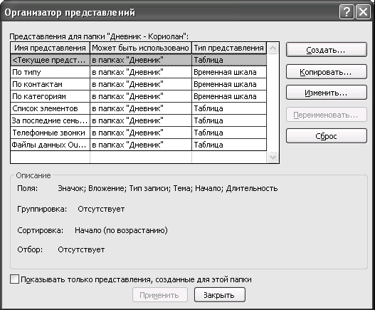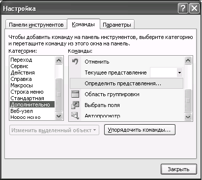 2. В меню Сервис/Настройка на вкладке «Команды» выберите в левой колонке пункт «Дополнительно», затем из правой колонки возьмите мышкой кнопки «Текущее представление» и «Определить представления» и перетащите их на панель инструментов в верхней части экрана.