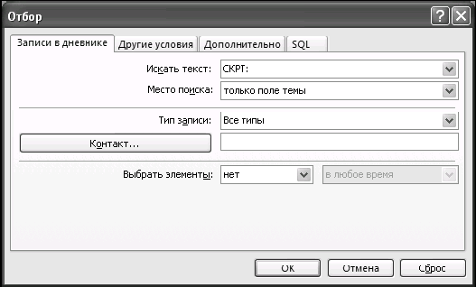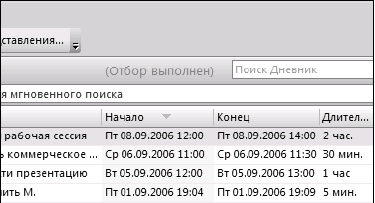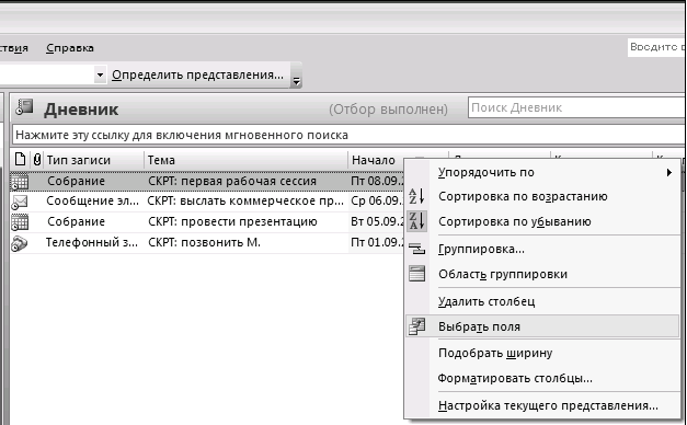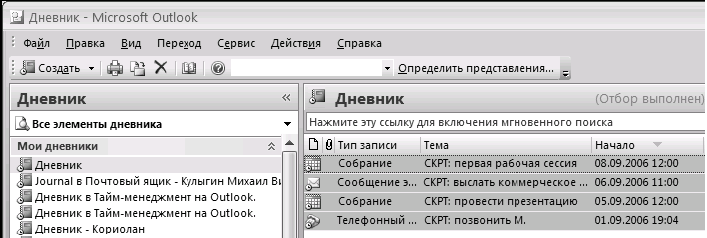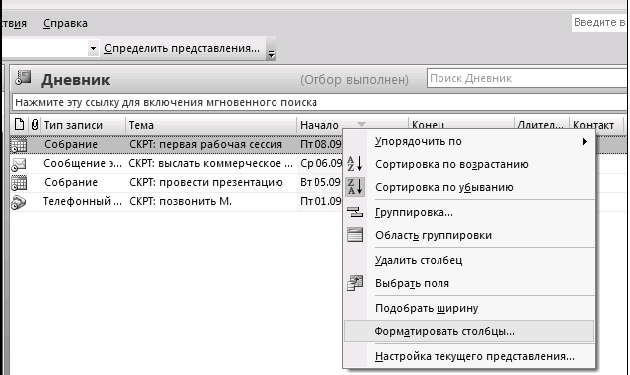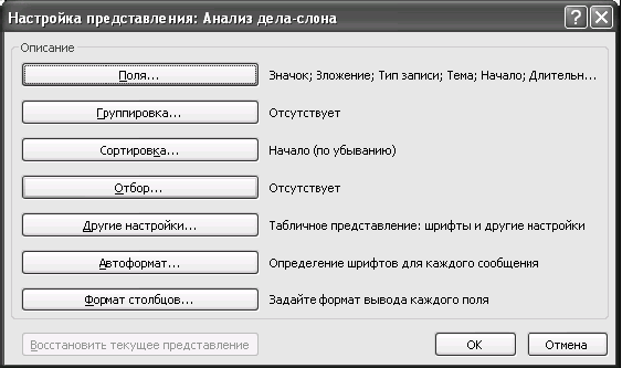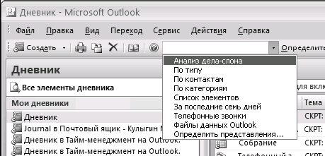 Теперь, чтобы отобрать все дневниковые записи, касающиеся нашего «слона», достаточно в меню «Текущее представление» на панели инструментов вместо стандартного представления «По типу» выбрать настроенное нами представление «Анализ дела-«слона».