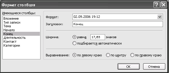 5. В появившемся окне «Формат столбцов» выберите формат типа «02.09.2006 19:12» (дата и время без дня недели).