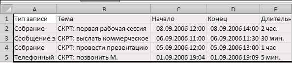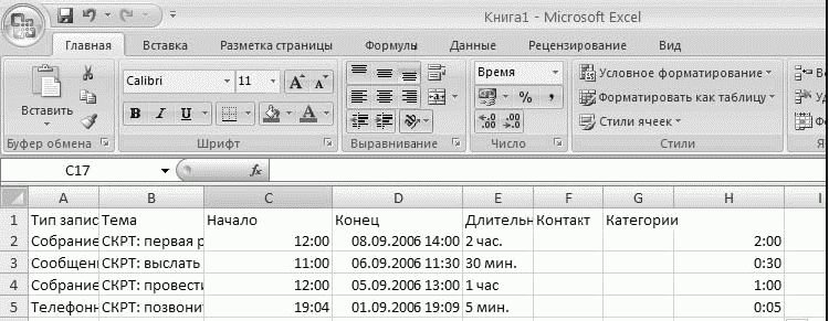 Итак, мы получили столбец (на рисунке – столбец Н), в котором вычисляется длительность каждой дневниковой записи. (К сожалению, воспользоваться для наших целей готовым столбцом «Длительность» из Outlook затруднительно, так как кроме цифр он содержит словесные обозначения единиц времени («час.», «мин.»), которые препятствуют автоматической обработке данных.)