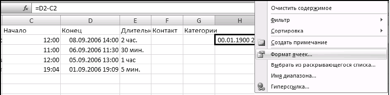 1. В колонке справа от той, в которую из Outlook скопировался столбец «Конец», введите формулу: ячейка равна ячейке из столбца «Конец» минус ячейка из столбца «Начало». На нижеследующем рисунке это означает: в ячейке H2 ввести формулу «=D2-C2». Таким образом мы вычислим длительность нашей дневниковой записи.
