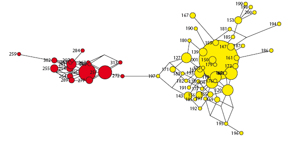 Слева, красным – славяне, справа – евреи. Каждый кластер имеет свое ядро, и облако более мутированных гаплотипов вокруг. Чем больше одинаковых гаплотипов – тем больше размер кружка. Ясно, что перед нами два разных этнических, генеалогических сообщества.