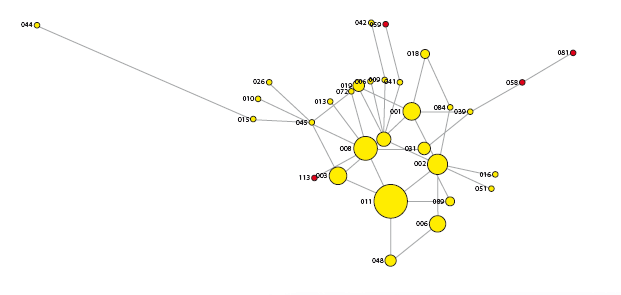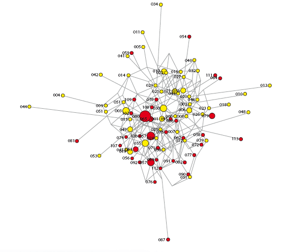 А вот как выглядят кластеры славян и индусов. На графике ниже – 113 человек, примерно поровну тех и других. Красным, опять, славяне, желтым – индусы. Практически полное наложение кластеров. Добавлю, что 27 из 113 гаплотипов перекрестно идентичны – у славян и индусов. И это – по 12-маркерным гаплотипам! Стоит привести, что для 12-маркерного гаплотипа вероятность случайного совпадения для двух человек – один из сотен и тысяч. А здесь – перекрестно идентичны 27 из 113!
