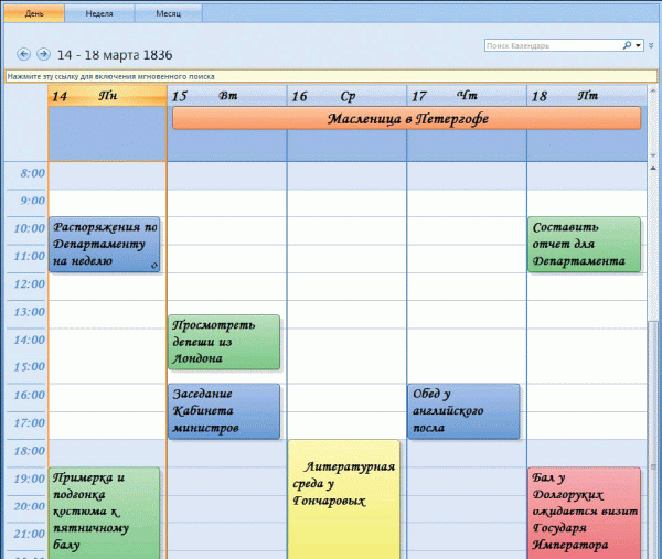 Оранжевым цветом в верхней части календаря выделено многодневное событие.