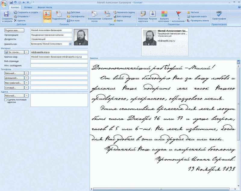 В поле заметок вставлен текст письма этому человеку, позволяющий вспомнить обстоятельства знакомства.