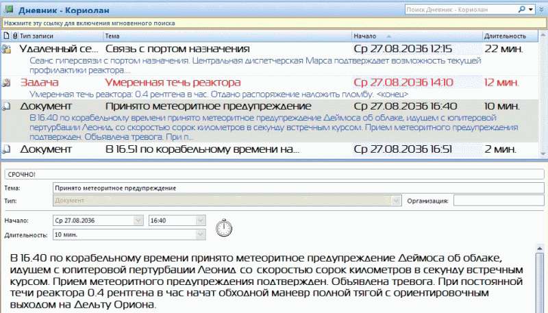 Записи, содержащие текст «Течь реактора», автоматически выделены красным цветом.