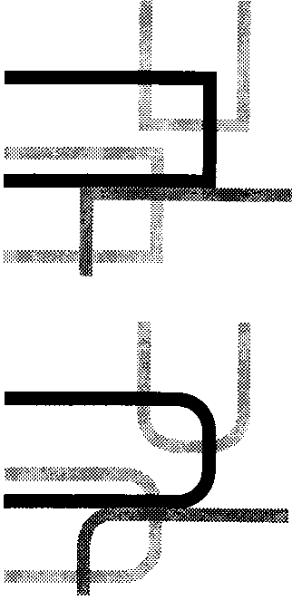 Следующий шаг — интеграция дуг с другими формами, в первую очередь с «главной компьютерной формой», прямоугольником. Так возникают прямоугольники с закруглениями вместо углов — еще один весьма популярный графический мотив в современном дизайне. В нем счастливо сочетаются, дополняя и уравновешивая друг друга, округлость круга и прямоугольность прямоугольника; круг в нем обнаруживает все–таки присущее ему горизонтально–вертикальное начало, а прямоугольник избавляется от назойливой угловатости, цепляющей взгляд (рис. 14). Правда, прием этот достаточно требователен — стоит ввести в композицию один закругленный прямоугольник, как он почти наверняка потребует скругления всех остальных углов, что заметно изменит общий стиль композиции (пример 12). Хороший пример целостного корпоративного стиля, основанного на закруглениях по дугам окружностей, можно найти на сайте http://www.macromedia.com/.
