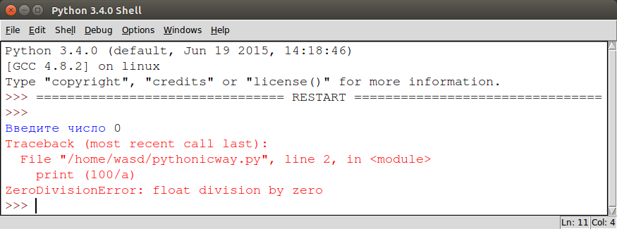 Возьмем в качестве примера следующий скрипт. Программа спрашивает у пользователя число и делит сто на это число: