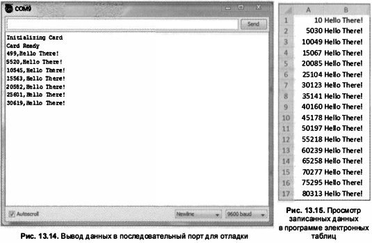 При возникновении ошибок проверьте правильность подключения переходника, убедитесь, что SD-карта отформатирована и должным образом вставлена. Для проверки корректности записи данных вставьте SD-карту в компьютер и откройте файл в программе просмотра электронных таблиц (рис. 13.15). Обратите внимание,