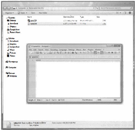Вставьте SD-карту в компьютер и создайте на ней новый текстовый файл с именем speed.txt. В этом файле просто введите время обновления в миллисекундах. На рис. 13.16 показано, что я задал время, равное 1000 мс ( 1 с).