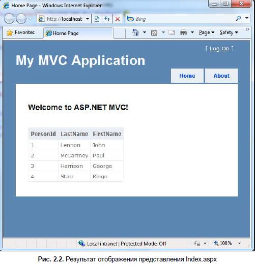 Чтобы продемонстрировать эту возможность, используем декларативный источник данных sqlDataSource и GridView в представлении Index.aspx, в результате получим страницу, приведенную на рис. 2.1. Код страницы приведен в листинге 2.7.