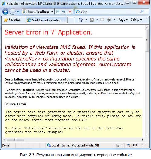 Результат обращения к действию Index контроллера Home представлен на рис. 2.2. Если, к примеру, включить возможность сортировки в GridView, после чего щелкнуть по ссылке в заголовке таблицы, то будет отображена ошибка, представленная на рис. 2.3, поскольку MVC Framework не позволяет корректно обработать серверные события.