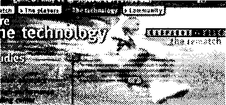 На внутренних страницах сайта визуал обычно сводится на роль призаголовочной графики (пример 9). Иногда используется сквозной визуал, повторяющийся на всех страницах сайта и обычно входящий в состав другого постоянного элемента — блока логотипа или навигационной панели. Такие визуалы уже не могут меняться чаще, чем весь дизайн сайта, и «визуальная» функция в них почти уступает свое место «фоновой» (см. пример на стр.319), Тем не менее довольно часто, особенно в призаголовочной графике, определяющими для выбора картинки являются ее сюжет и тема — что, по–видимому, и следует считать основным признаком визуала в отличие от других жанров веб–графики.