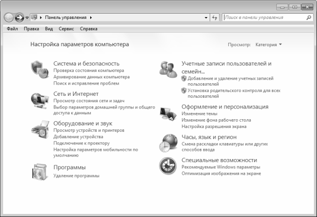 Вы можете в любой момент выбрать и применить любую из имеющихся тем оформления. Переход в режим просмотра и выбора тем оформления осуществляется из панели управления, которая вызывается с помощью команды Пуск ? Панель управления (рис. 3.2).