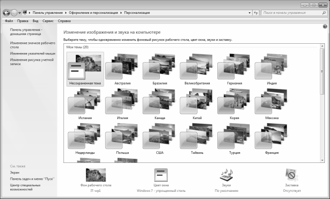 Более подробно с панелью управления Windows 7 мы познакомимся ниже, в соответствующем разделе. Сейчас нам нужно лишь выбрать в этом окне ссылку Изменение темы (она находится в категории Оформление и персонализация) – в результате окно примет вид, как показано на рис. 3.4.