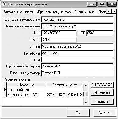 Ввод сведений об организации (предпринимателе) осуществляется в окне настройки программы на вкладке Сведения о фирме, содержимое которой представлено на рис. 4.1.
