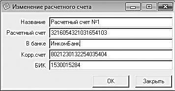 Иногда может потребоваться изменение параметров введенного ранее банковского счета (например, при смене обслуживающего банка). Для этого нужно выделить данный счет в списке курсором и нажать кнопку Изменить. В результате на экране откроется окно, как на рис. 4.2, в котором выполняются необходимые действия.