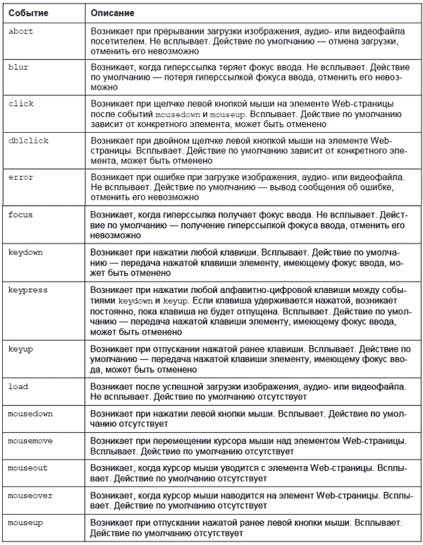 Самые полезные для нас на данный момент события, поддерживаемые объектом Element библиотеки Ext Core, представлены в табл. 15.1. Их довольно много, и некоторые из них поддерживаются только определенными элементами Web- страницы.