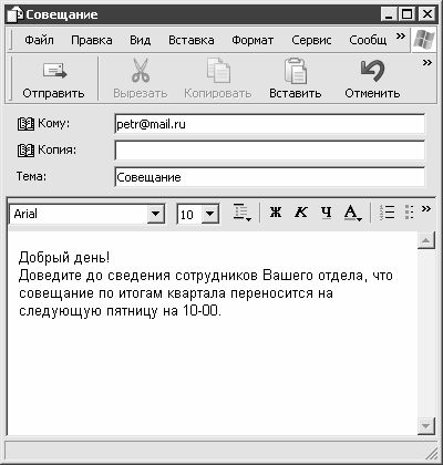 Не стоит забывать, что любое действие, выполненное при создании либо редактировании почтового сообщения (форматирование, удаление фрагмента текста, и т. д.), в случае необходимости можно отменить. Для отмены последнего выполненного действия предназначена команда главного меню Правка?Отменить, вызываемая также нажатием комбинации клавиш Ctrl+Z. Также для этого можно воспользоваться кнопкой Отменить, которая расположена в инструментальной панели (см. рис. 2.15).