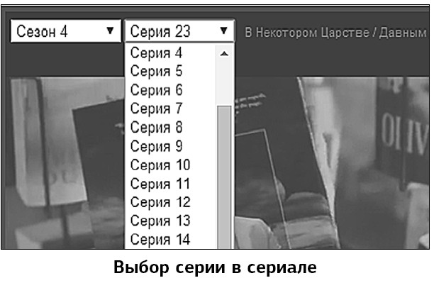 На втором экране (см. следующую фотографию) сериал состоит из 4 сезонов по 23 серии в каждом. Об этом мы узнаем, если посмотрим в верхний левый угол экранчика. Щелкаем левой клавишей мышки по черным треугольничкам справа от цифры и из выпадающего списка выбираем нужную серию и сезон.