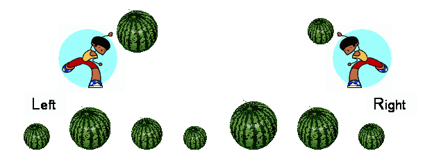 Пройдясь вдоль ряда, Райт прикинул на глазок вес среднего по величине арбуза. «Запомни этот вес, – сказал он Лефту, – и ступай к началу ряда», – а сам отправился в другой конец. «Теперь иди ко мне, пока не найдешь арбуз тяжелее указанного мною». Лефт так и сделал, – найдя первый такой арбуз, он остановился и крикнул об этом Райту. «Теперь моя очередь!» – отозвался Райт и стал двигаться навстречу Лефту, попутно отыскивая арбуз, легче среднего. Дойдя до такого арбуза, Райт остановился и скомандовал: «Меняем арбузы местами!», – и друзья швырнули арбузы друг другу.