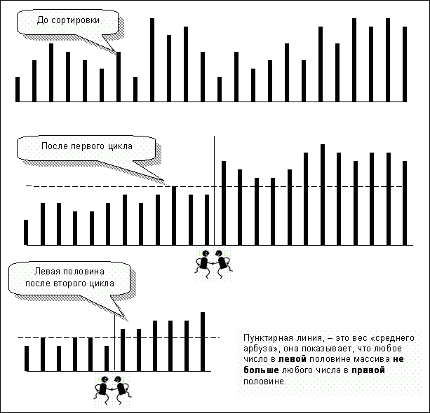 – А то, что теперь эти две половинки ряда можно сортировать отдельно. Смекнул? Нам меньше бегать придется, ведь расстояния вдвое короче!