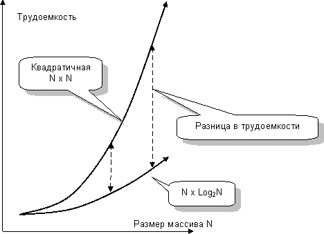 Рис.97 – Рост трудоемкости сортировки с ростом размера массива