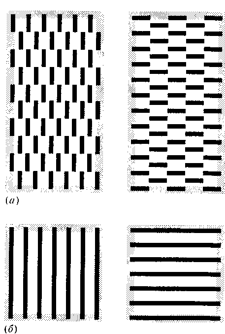 Если элементы узора или текстуры вытянуты в каком–то одном направлении, сама фигура также будет выглядеть удлиненной в этом направлении и сплющенной в перпендикулярном (рис. 5, а). На этом основан известный совет полным людям носить одежду с продольными, а ни в коем случае не поперечными полосами. Интересно, однако, что именно в случае узора из простых полосок следование этому совету может дать совершенно обратный эффект: так как при движении глаза поперек полос узор выглядит значительно пестрее и потому визуально «тяжелее», чем вдоль, полосатый квадрат всегда кажется шире в направлении, перпендикулярном полосам (рис. 5, б).