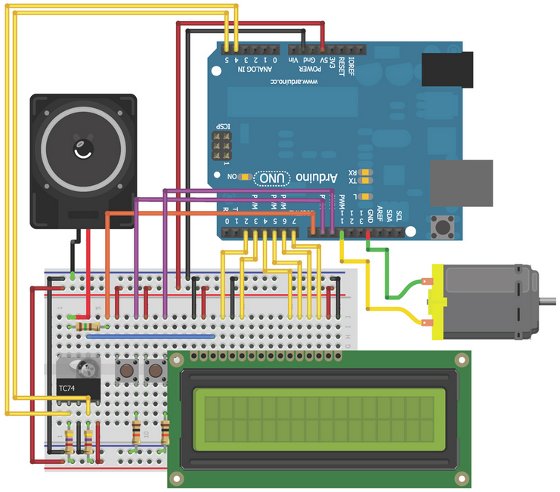 Давайте теперь заставим дисплей выполнять полезную функцию. Добавим I2C датчик температуры, рассмотренный в главе 8, вентилятор и динамик из главы 5.