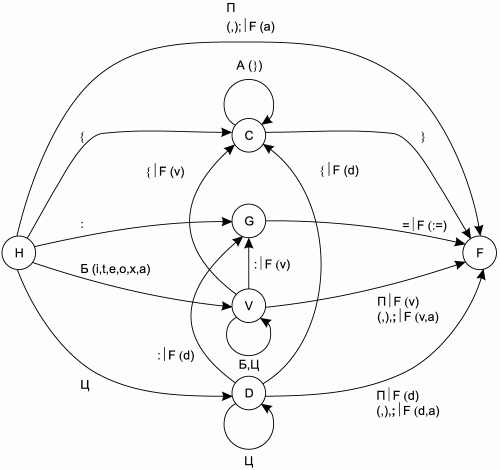 Состояние H – начальное состояние КА, а состояние F – его конечное состояние. Поскольку КА работает с непрерывным потоком лексем, перейдя в конечное состояние, он тут же должен возвращаться в начальное, чтобы распознавать очередную лексему. Поэтому в моделирующей программе эти два состояния можно объединить.