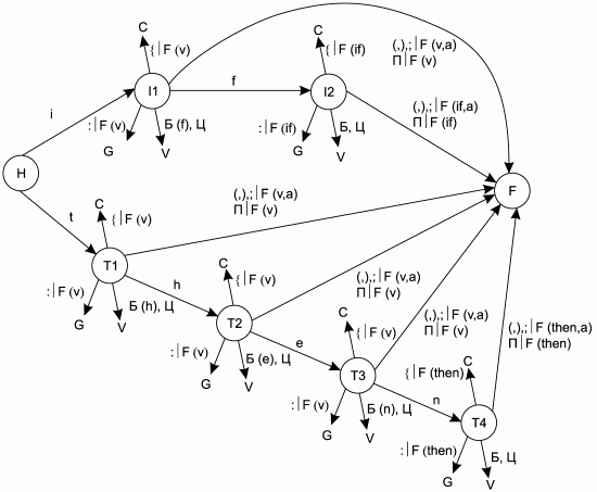 На рис. 2.2 изображен фрагмент графа переходов КА, отвечающий за распознавание ключевых слов if и then (этот фрагмент имеет ссылки на состояния, изображенные на рис. 2.1). Аналогичные фрагменты можно построить и для других ключевых слов.
