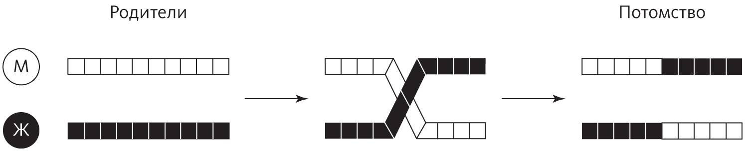 Если снять с полового размножения все лишнее (не хихикайте), останется суть: обмен генетического материала между хромосомами отца и матери. Этот процесс называется кроссинговер, и его результат — появление двух новых хромосом. Первая состоит из материнской хромосомы до точки перекреста, после которой идет отцовская, вторая — наоборот: