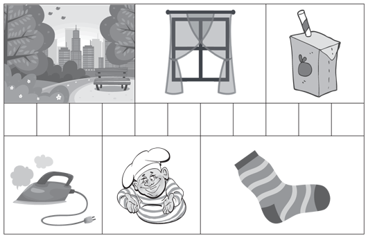 По верхнему ряду рисунков кроссворд разгадывается следующим образом: «парк, окно, сок», по нижнему ряду – «пар, кок, носок».