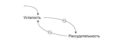 Рис. 26.1. Усталость негативно влияет на рассудительность, которая негативно влияет на усталость