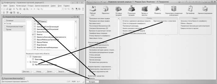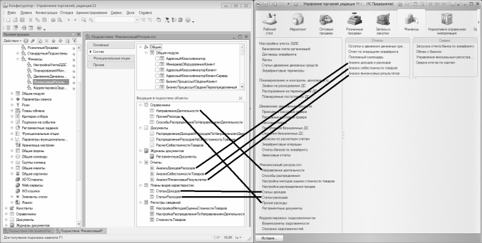 Рис. 7.23. Пример взаимосвязи объектов конфигурации подсистемы Финансы ? Финансовый результат с элементами интерфейса в разделе «Финансы» (слева – «Конфигуратор», справа – прикладное решение)