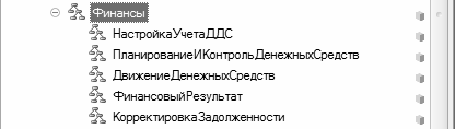 Отличительной чертой версии 8.2 по сравнению с предыдущими версиями программы является то, что сейчас структура подсистем, сформированная в «Конфигураторе», непосредственно влияет на интерфейс и инструментарий прикладного решения. Первому уровню подсистемы соответствует раздел в прикладном решении, нижеследующим ее уровням соответствуют названия групп команд на панели навигации, и применительно, например, к подсистеме «Финансы» это выглядит так, показано на рис. 7.22.