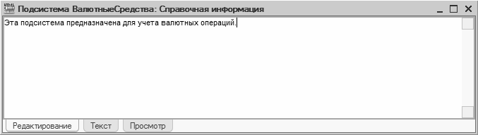 Как видно на рисунке, данное окно состоит из трех вкладок. На вкладке Редактирование осуществляется ввод и редактирование текста справки, на вкладке Текст этот текст отображается в формате HTML-кода, а на вкладке Просмотр можно посмотреть, как будет выглядеть введенный текст при вызове справки в режиме «1С Предприятие».