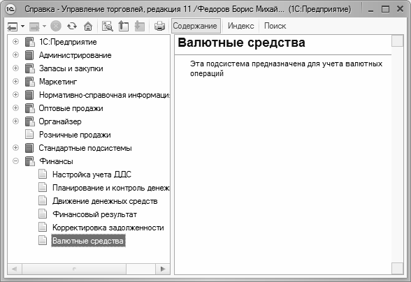 Теперь в режиме 1С: Предприятие вызовем содержание справки (это можно сделать нажатием комбинации клавиш Shift+F1), откроем ветвь Финансы и увидим, что в ней появился раздел Валютные средства (рис. 7.30).
