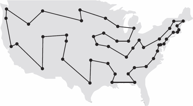 Давайте посмотрим, какая проблема свалилась на Мэри – коммивояжера компании US Gavel Corporation, зарегистрированной в Вашингтоне, округ Колумбия. Директор проучил Мэри объехать столицы всех сорока восьми континентальных штатов и попытаться убедить местные власти вложить средства в его замечательную фирму. Транспортные расходы необходимо было свести к минимуму, и от Мэри требовалось найти оптимальное решение – кратчайший маршрут, проходящий через все сорок восемь столиц. Посидев немного над картой Америки, Мэри набросала на ней план поездки и после некоторых поправок представила его начальству. Маршрут получился довольно симпатичный.