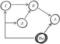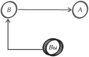 Когда вы можете вступить в контакт с нужными людьми, опуститесь на одну ступень вниз по цепочке влияния или по иерархической лестнице. Если В – единственный, к кому может прислушаться А, но вы не в состоянии добиться аудиенции В, найдите людей, имеющих наибольшее влияние на В. Затем вступите в контакт с ними и изложите суть своего вопроса. С этой позиции вы можете двинуться дальше, до тех пор, пока ваше влияние не достигнет нужной цели (рис. 16.7).