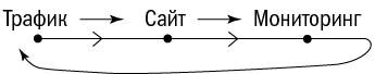 Стадия привлечения посетителей на страницу открывает график реализации (слева), затем люди переходят на сайт, и наступает следующая стадия, которая переносит посетителей опять на стадию привлечения. В качестве промежуточных моментов допустимы телефонные звонки или прямая почтовая рассылка.