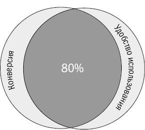 Около 80 % оптимизации коэффициента конверсии совпадает с удобством использования. Но, с той же стороны, оставшиеся 20 % (по 10 %) имеют огромное значение (рис. 1.2).
