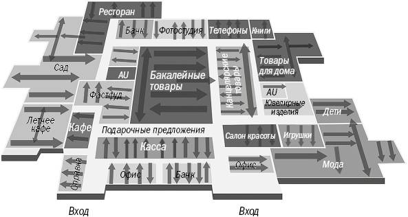 Zappos и IKEA работают по существенно отличающимся методикам, но обе компании очень преуспели. Теперь задумайтесь о покупках в каком-нибудь месте, например в Walmart. Там вам позволено ходить где угодно, и управляющие магазинами пытаются сделать это настолько просто, насколько возможно, с помощью широких проходов и обилия стендов для проб и дегустаций. Много людей проходят по торговым залам, так или иначе не пропуская ни одного товара (рис. 1.4).