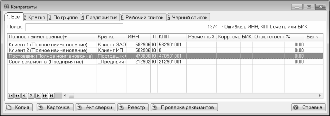 В данном окне представлен список введенных ранее контрагентов. Для каждого контрагента отображается его полное и краткое наименование, индивидуальный номер налогоплательщика, признак юридического или физического лица, код причины постановки на учет, банковские реквизиты и иная информация.