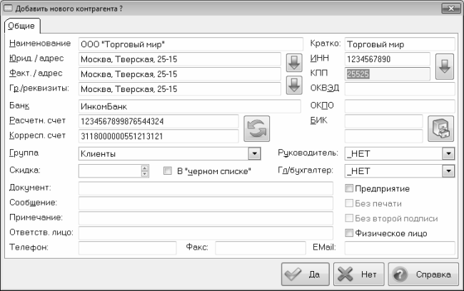 Завершается процесс добавления в справочник нового контрагента нажатием в данном окне кнопки Да. При нажатии кнопки Нет данное окно будет закрыто без сохранения выполненных изменений.