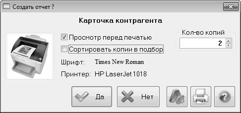 В данном окне осуществляется настройка формирования отчета. Если установлен флажок Просмотр перед печатью, то после нажатия в данном окне кнопки Да на экране отобразится печатная форма отчета; при снятом данном флажке документ будет сразу отправлен на печать, без предварительного просмотра. По умолчанию данный флажок установлен.