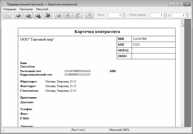 Пример печатной формы карточки контрагента представлен на рис. 3.10.