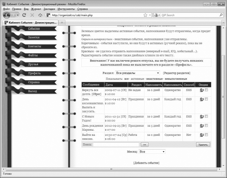 Игнорировать этот факт разработчики облачных технологий, конечно, не могли, и сегодня в Интернете можно найти немало онлайн-органайзеров на любой вкус. В этой книге мы познакомим вам с одним удобным популярным ресурсом, которым можно пользоваться «на халяву» – он находится по адресу http://organizeit.ru.